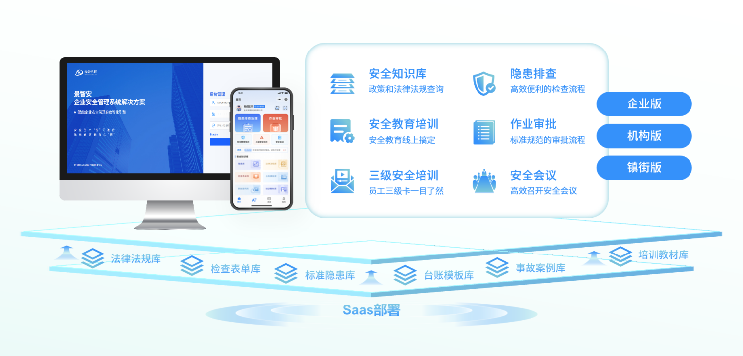 “景智安”企业安全管理产品有丰富的系列,企业、机构、镇街,可根据各自的安全管理需求,有选择性进行版本的选用。